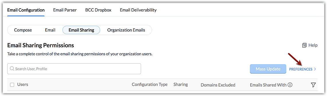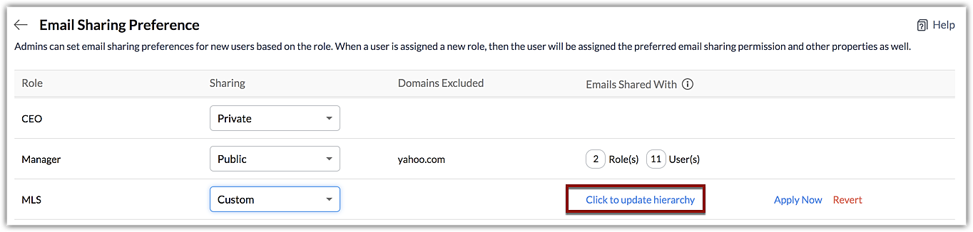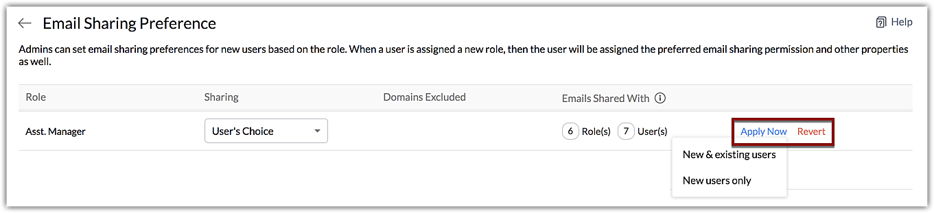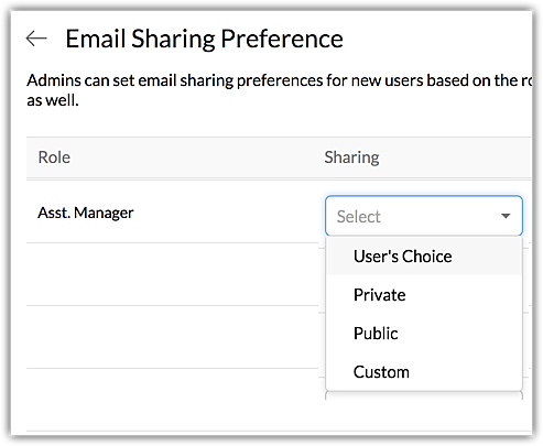 La préférence d'e-mail permet aux utilisateurs disposant d'un profil d'administrateur de définir des autorisations de partage d'e-mails en fonction des rôles. Par exemple, si l'organisation exige que tous les responsables adjoints partagent des e-mails avec leurs collègues en fonction des besoins, il est beaucoup plus facile de définir l'autorisation de partage d'e-mails pour ce rôle comme préférence de l'utilisateur. Ainsi, tout utilisateur qui occupe le rôle d'assistant Manager aura le même privilège.