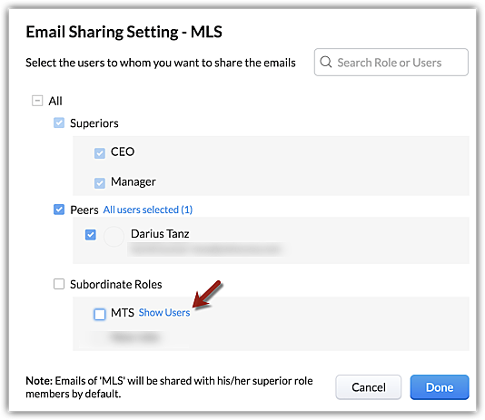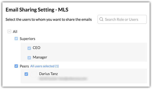 - Dans la page Email Sharing Setting (Paramètres de partage d'e-mails), sélectionnez Roles (rôles), Peers (pairs) ou Subordin