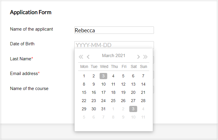 Afin de résoudre le problème des formats de dates différents et de mettre en place une méthode de saisie standard, un sélecteur de date permet aux utilisateurs de choisir une date dans un calendrier contextuel. La date s'affiche dans le format défini par l'utilisateur CRM. Ainsi, les utilisateurs peuvent facilement renseigner leur date préférée dans les champs Date et Date-Heure. Les dates sélectionnées apparaîtront dans un format spécifique, qui peut être configuré sous Format Date au moment de la configuration du champ. Par exemple, si un champ Date de naissance figure dans un formulaire Web de demande pour lequel vous avez défini le format MM/JJ/AAAA, toutes les dates choisies dans le sélecteur de date s'affichent selon le modèle spécifié.