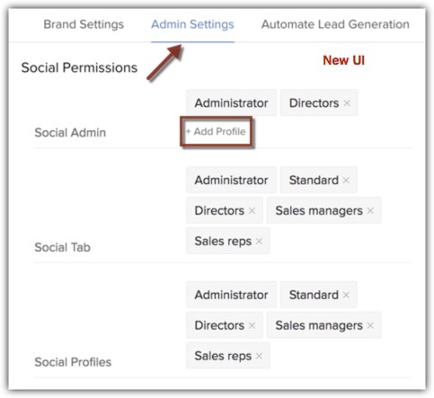 Désormais, vous pouvez ajouter les profils CRM à partir de la page de configuration en cliquant sur l'onglet Paramètres administrateur (Configuration > canaux > réseaux sociaux). L'autorisation sociale est divisée en trois parties : l'administration sociale, l'onglet social et les profils sociaux. Vous devez ajouter individuellement les profils à chaque section en fonction de la personne au sein de votre organisation qui gère les activités sur les réseaux sociaux.