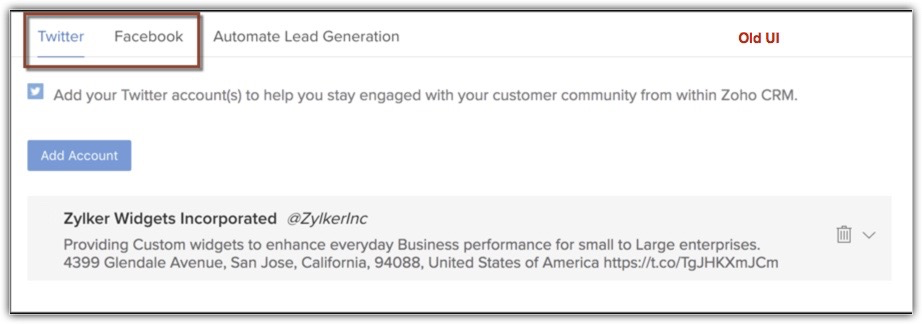 Auparavant, les plates-formes sociales (Twitter et Facebook) étaient affichées sous forme d'onglets distincts sur la page de configuration des réseaux sociaux (Configuration > canaux > réseaux sociaux), où vous avez ajouté individuellement les descripteurs sociaux de l'organisation.