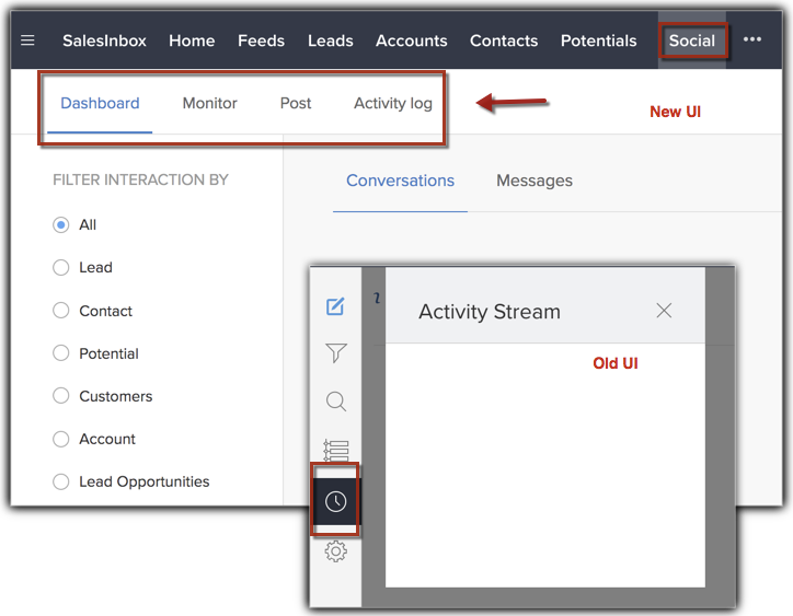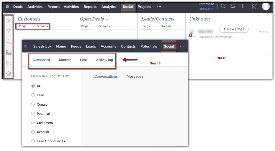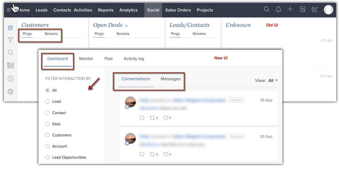 Vue CRM : auparavant, vous avez pu voir les interactions des transactions en cours, leads/Contacts, Inconnu et clients dans la vue CRM de l'onglet social. Ces interactions étaient classées sous Pings et Streams.