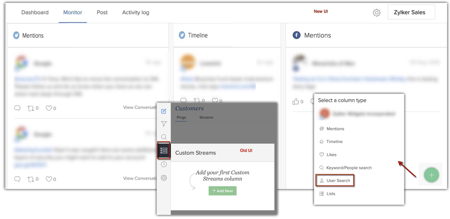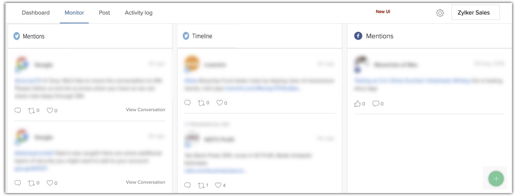 Dans Monitor, vous pouvez créer une vue pour un type d'interaction de Twitter ou Facebook et l'ajouter en tant que colonne. Par exemple, vous ajoutez une colonne pour les chronologies sous Twitter et affichez les détails associés. De même, vous pouvez créer une vue pour les mentions de page sous Facebook. Cela vous donnera une vue globale de tous les détails liés à la chronologie et aux mentions au même endroit.