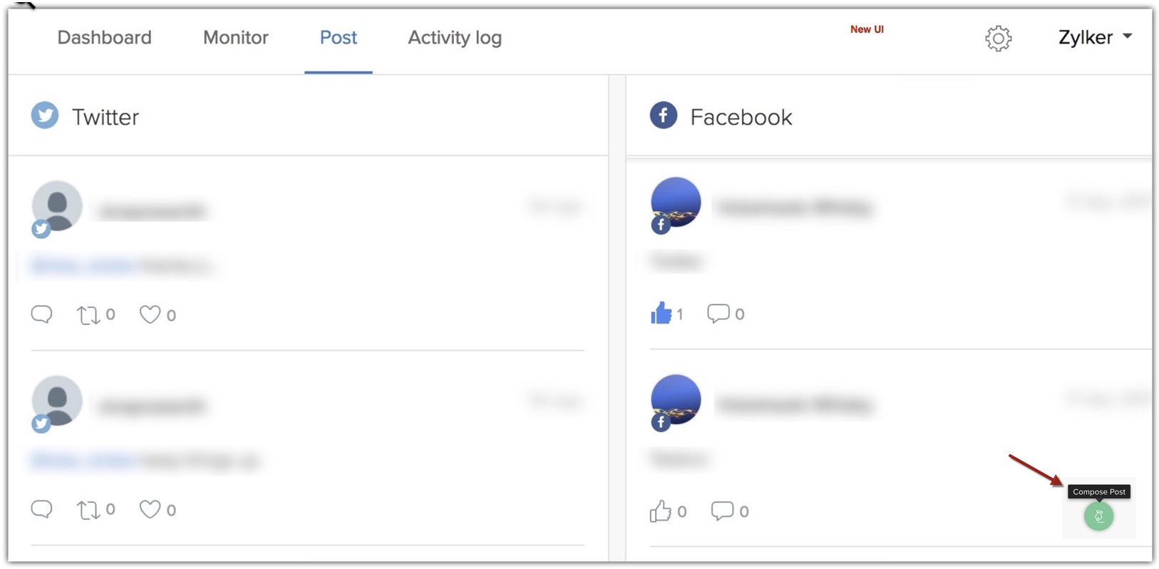 Dans Post, vous pouvez voir les publications des clients sur les deux réseaux sociaux. Vous pouvez rédiger une publication à partir de cet onglet et choisir la marque sous laquelle elle doit être publiée, si votre entreprise héberge plusieurs marques.
