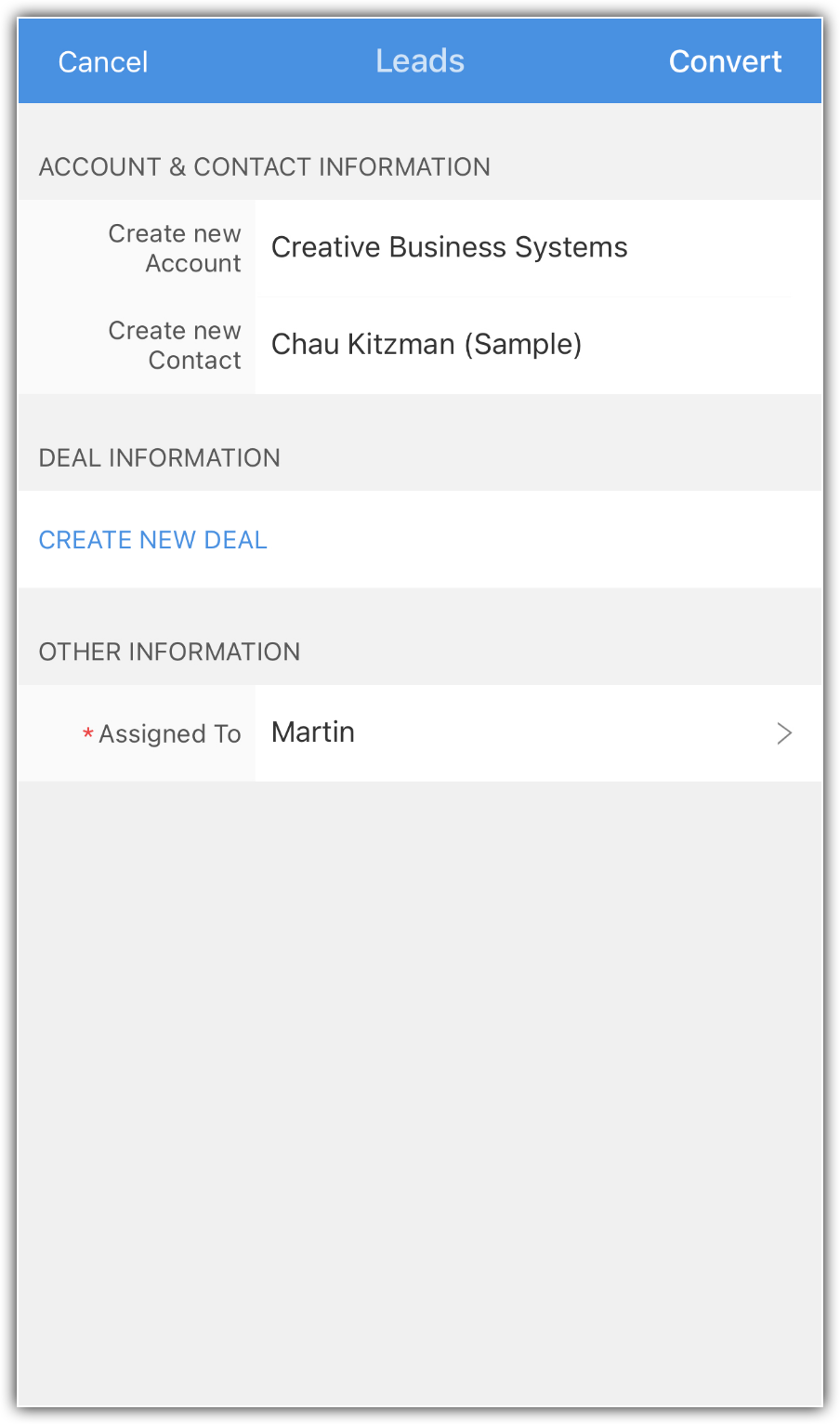 - Dans l'écran Convert Leads, indiquez les informations nécessaires.