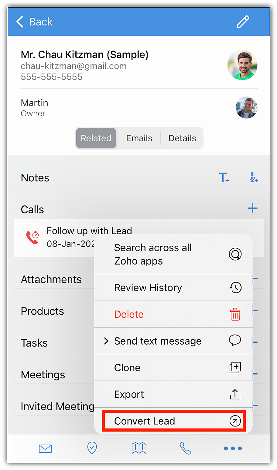 - Ouvrez le module Leads ou Contacts et sélectionnez l'enregistrement que vous souhaitez sauvegarder.