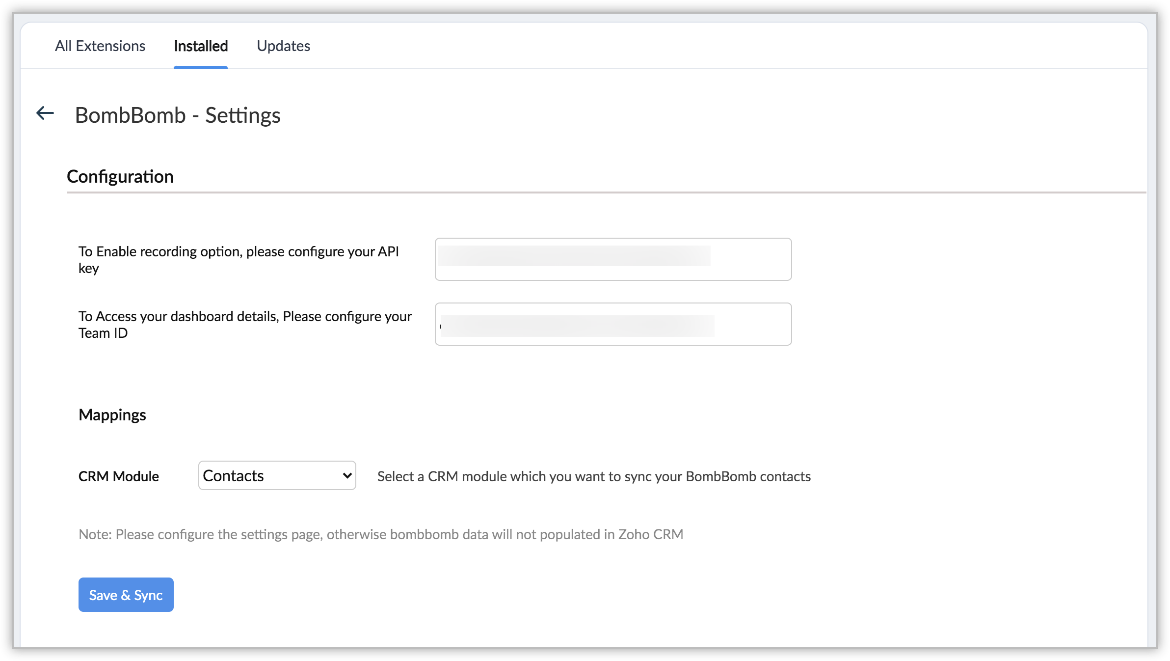 Remarque : dans BombBomb, plusieurs équipes sont prises en charge. Seuls les détails de l'équipe correspondant à l'identifiant d'équipe fourni par l'utilisateur sont affichés dans l'extension.