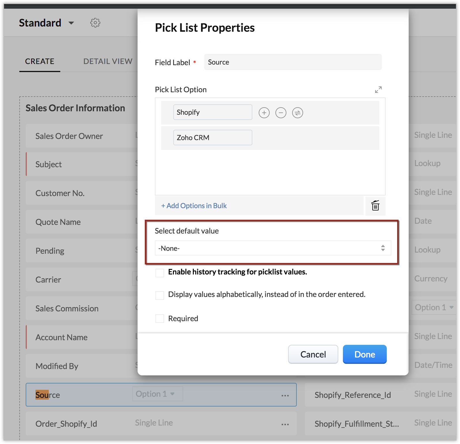 Pour les utilisateurs existants uniquement : pour créer des produits et des commandes clients depuis Zoho CRM vers Shopify, la valeur du champ Source doit être définie sur « Shopify ». Pour ce faire, accédez à Configuration > Personnalisation > Modules et champs > Commandes client. Sous Mises en page, cliquez sur Standard. Sélectionnez Source > Modifier les propriétés > et définissez Sélectionner une valeur par défaut sur aucun.