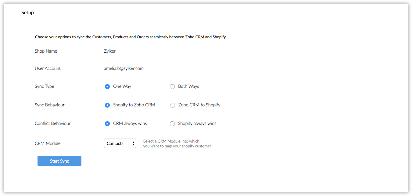 La synchronisation unidirectionnelle permet de transférer les données de Shopify dans votre Zoho CRM ou vice versa, mais pas les deux. La synchronisation bidirectionnelle déplace simultanément des données CRM vers Shopify et des données Shopify vers le système CRM.