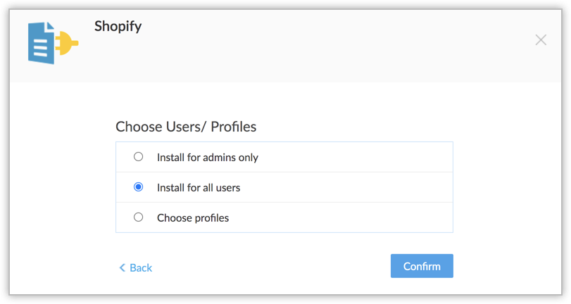 Choisir les profils : l'extension est installée dans CRM pour les utilisateurs sélectionnés manuellement. Sélectionnez cette option, cliquez sur Continuer, puis sélectionnez le profil souhaité.