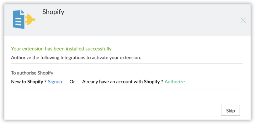 Vous pouvez accéder à Zoho Marketplace et installer l'extension Shopify, ou vous connecter à votre Zoho CRM et l'installer.