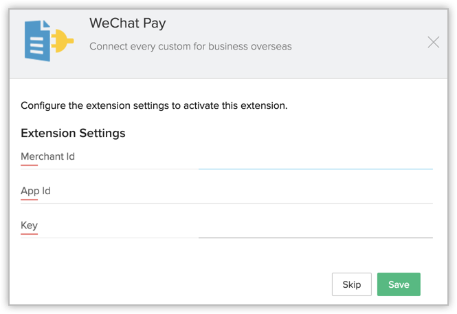 - Dans Paramètres de l'extension, saisissez l'Identifiant du commerçant, l'identifiant de l'application et la clé.