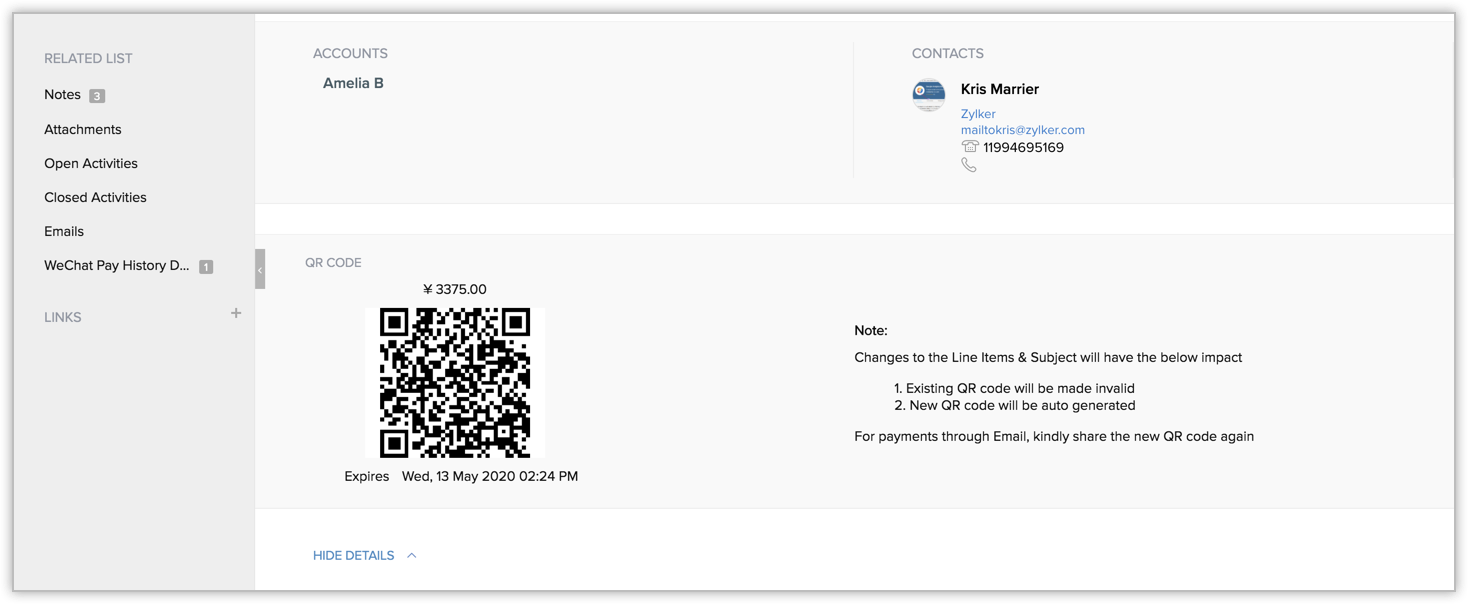 Si vous revenez à la facture après l'expiration de ce délai dans Zoho CRM, le code QR sera automatiquement généré une nouvelle fois dans le widget Carte de visite et pourra être partagé à nouveau. Toutefois, si le client accède à un code QR expiré dans l'e-mail envoyé, vous devez générer une nouvelle fois le code QR et le renvoyer.