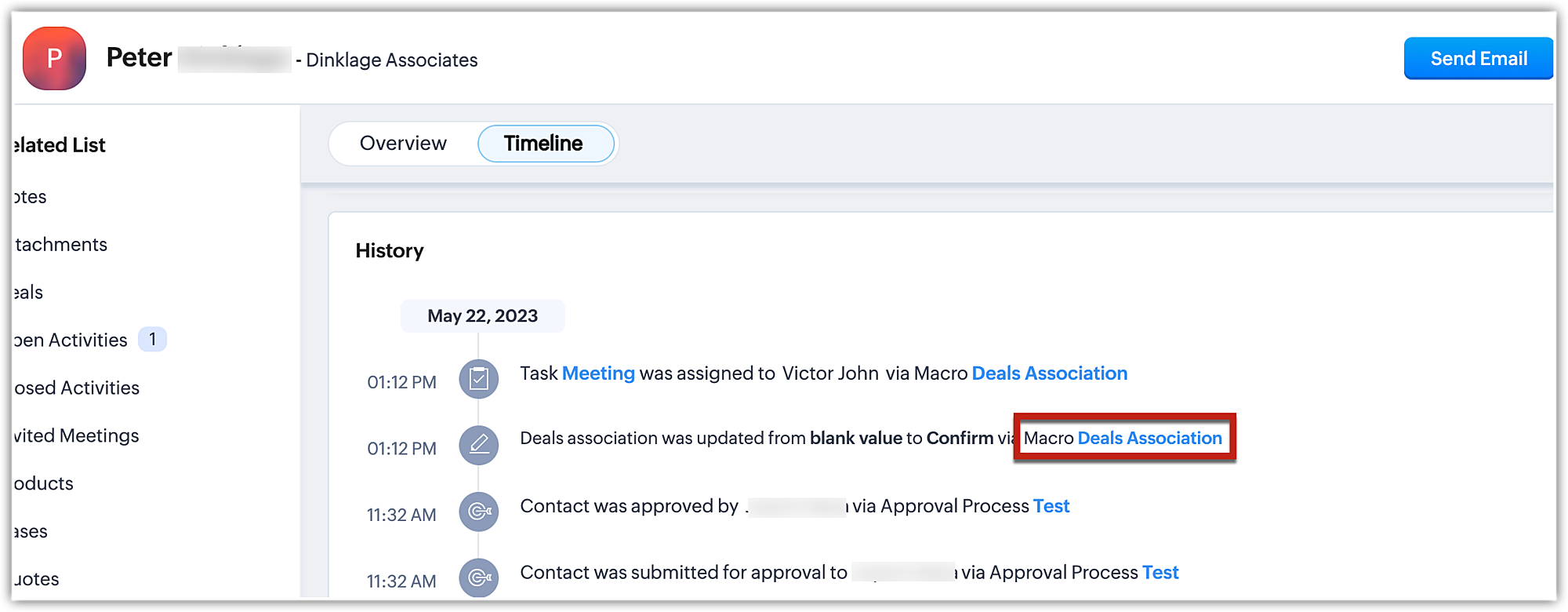 Si l'option Email Opt-Out est activée, l'e-mail ne sera pas envoyé. Vous pouvez également visualiser les actions effectuées ou les e-mails envoyés dans la chronologie des enregistrements.