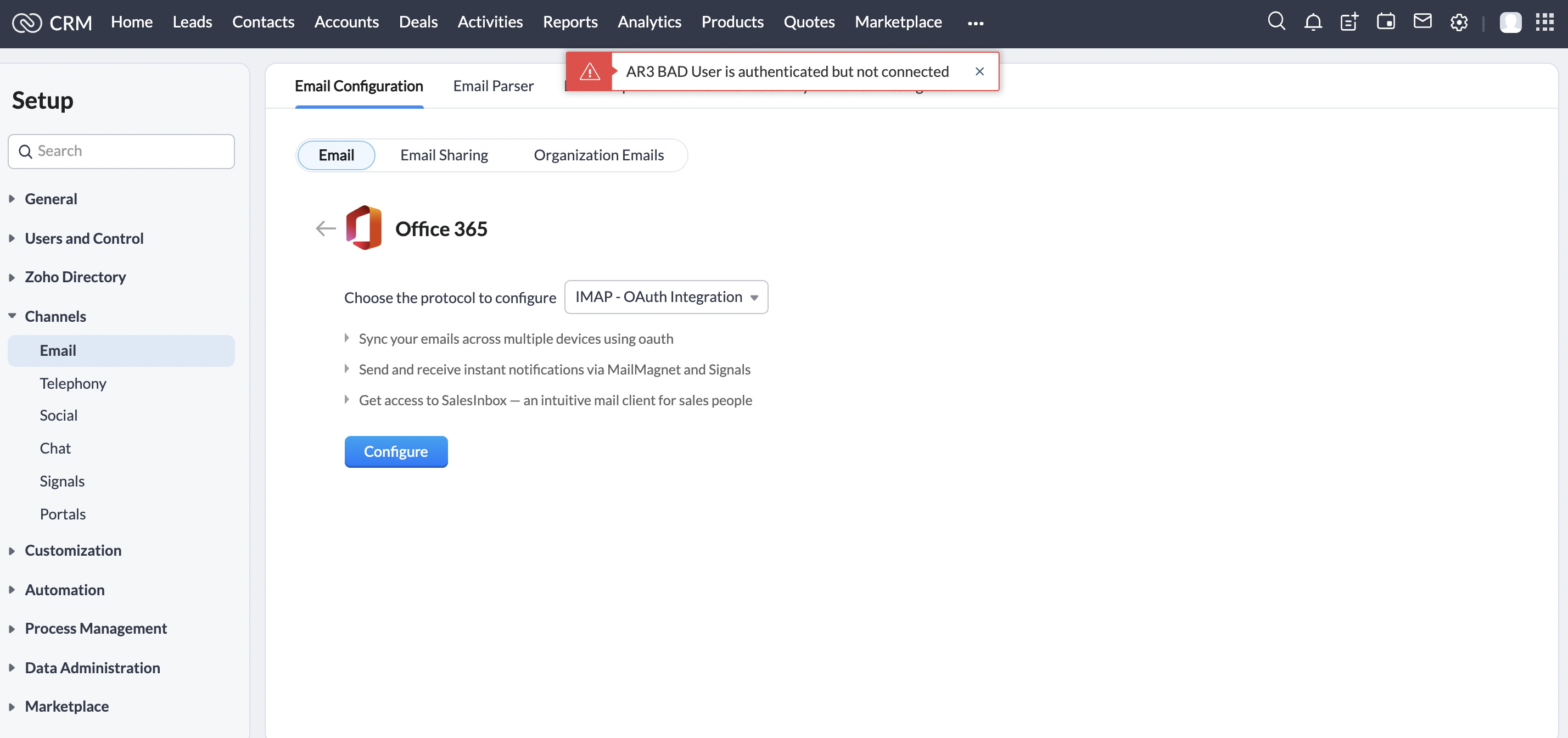 Lors de l'intégration de MS Outlook ou d'Office 365 via les protocoles IMAP-OAUTH ou POP3-OAUTH, si vous rencontrez les erreurs suivantes, procédez comme suit pour les résoudre.