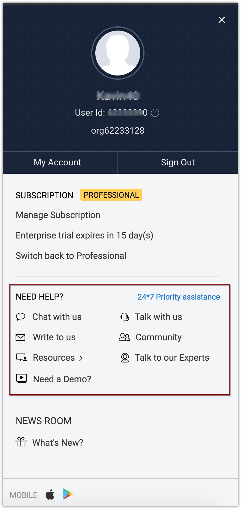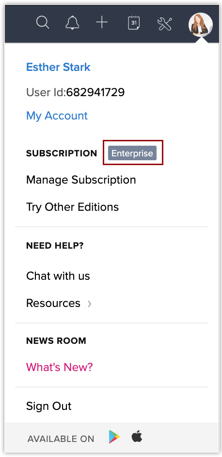 Pour savoir quelle édition de Zoho CRM vous utilisez, cliquez sur l'icône Profile dans le coin supérieur droit de votre fenêtre. L'édition s'affiche en regard de Subscription.