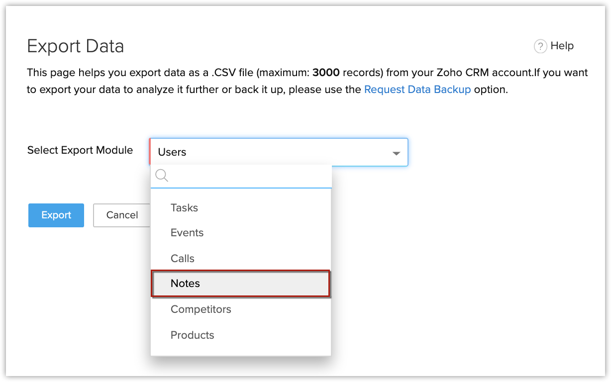 La fonctionnalité d'exportation des notes vous permet d'exporter les notes à partir de Zoho CRM au format CSV. Vous pouvez exporter un maximum de 3 000 notes à la fois.