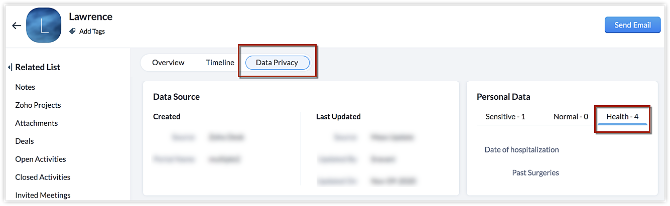 Tous les champs marqués comme contenant des données de santé personnelles seront répertoriés sur la page des détails de l'enregistrement. Sous Data Privacy, dans la section Personal Data, vous pouvez cliquer sur l'onglet Health pour afficher les champs contenant des données de santé personnelles.