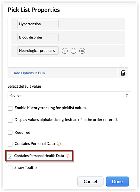 Dans un module, il ne peut y avoir que quelques champs contenant des informations de santé personnelles d'un client. Par exemple, antécédents chirurgicaux, symptômes, détails sur les médicaments, etc. Le fait de marquer ces champs comme étant des détails de santé personnels aidera le système à identifier et à restreindre l'accès à ces champs via l'API et à empêcher l'exportation des valeurs de ces champs. Dans chaque module, 25 champs au total peuvent être marqués comme contenant des données de santé personnelles.