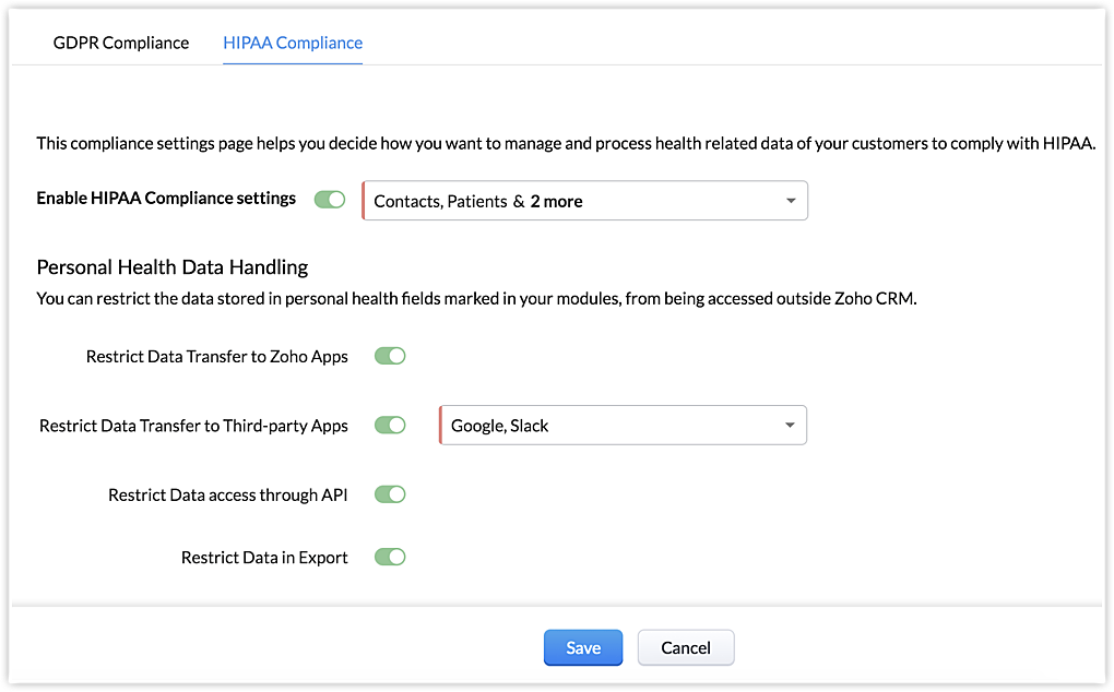 Restreindre le transfert de données vers les applications Zoho : si le compte CRM est intégré à d'autres applications Zoho telles que Desk, Campaigns et Projects, les données seront transférées de CRM vers ces applications. Cette option empêchera le transfert des données de santé personnelles vers d'autres applications.