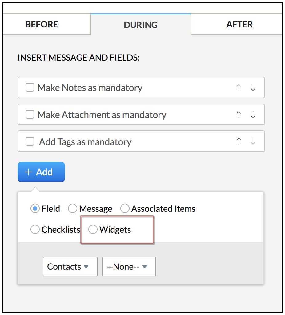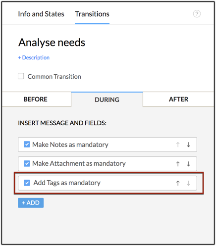 Cette section guide les propriétaires de transition dans l'achèvement d'une étape particulière d'un processus en les invitant à entrer des champs spécifiques, des remarques, des pièces jointes et d'autres informations contextuelles. Par exemple, dans le processus de suivi des transactions, les représentants commerciaux peuvent être tenus de saisir le pourcentage de réduction, des remarques et de joindre quelques documents commerciaux en fonction de la politique de l'organisation. Dans ce cas, tous ces détails peuvent être exigés dans la section During Transition (Pendant la transition) de la transition Negotiation (Négociation).