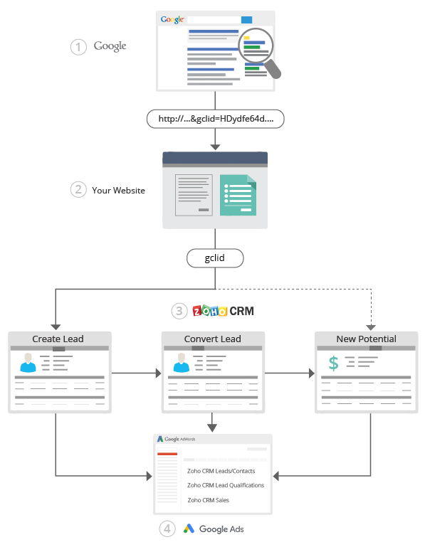 Un code de suivi conserve une trace du GCLID qui a été généré lors du clic sur la publicité. Il est conservé jusqu'à ce que l'utilisateur remplisse le formulaire et est transmis à Zoho CRM avec les détails indiqués dans le formulaire. |