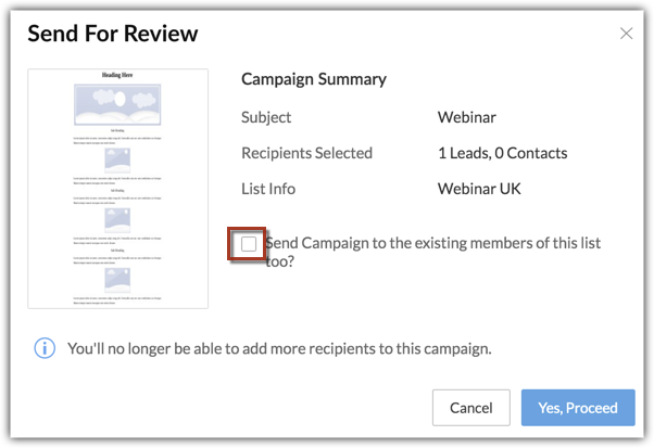 - Cochez la case Envoyer la campagne aux membres existants de cette liste également ? dans la fenêtre contextuelle Envoyer pour révision si vous souhaitez envoyer la campagne aux membres existants de la liste en plus des nouveaux destinataires.