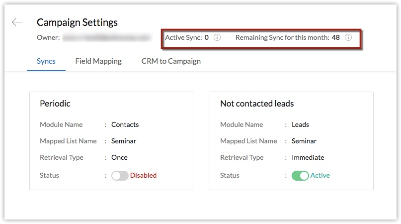 - La section Synchronisation active affiche le nombre de synchronisations actives et la section Synchronisations restantes pour ce mois affiche le nombre de synchronisations que vous pouvez lancer ce mois-ci. Vous pouvez lancer jusqu'à 10 synchronisations par jour et jusqu'à 50 synchronisations par mois.
