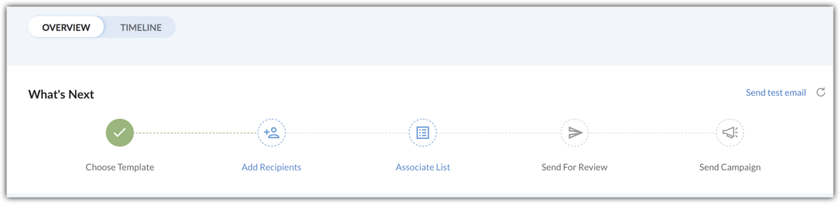 - Cliquez sur Choisir un modèle dans la section Étape suivante de la page de détails de la campagne. Vous serez redirigé vers Zoho Campaigns.