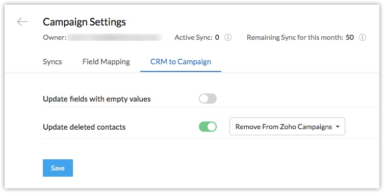 - Mettre à jour les champs avec des valeurs vides : lorsque cette option est activée, les valeurs supprimées des champs mappés dans Zoho CRM sont également mises à jour et supprimées de Zoho Campaigns.