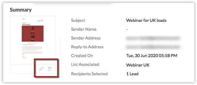 Remarque : utilisez l'icône Modifier/Supprimer pour modifier ou supprimer le contenu de l'e-mail avant d'envoyer la campagne. Si vous modifiez le modèle après l'avoir envoyé pour révision, la campagne sera déplacée vers Brouillon et vous devrez l'envoyer à nouveau pour révision.