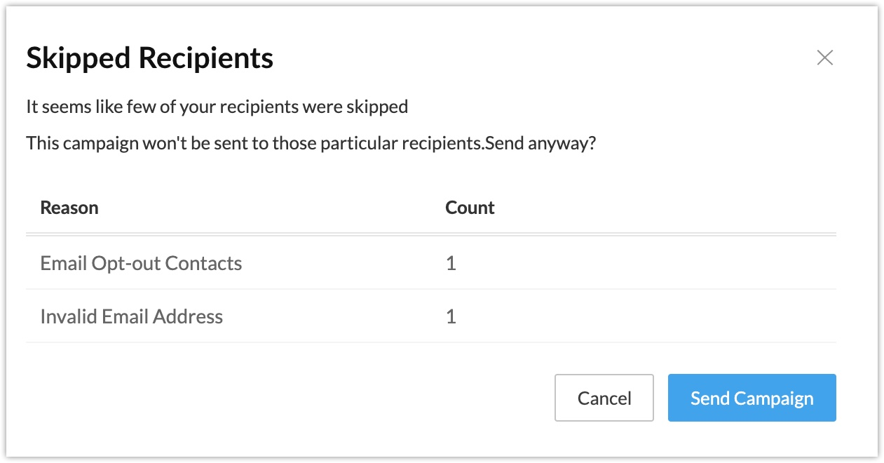 Envoyer la campagne : vous pouvez envoyer la campagne aux destinataires une fois la révision terminée. Si certains destinataires sont ignorés lors de la synchronisation, une icône d'avertissement s'affiche sous l'icône Envoyer la campagne. Cliquez sur l'icône pour voir la raison pour laquelle les destinataires ont été ignorés et le nombre d'enregistrements qui ont été ignorés.