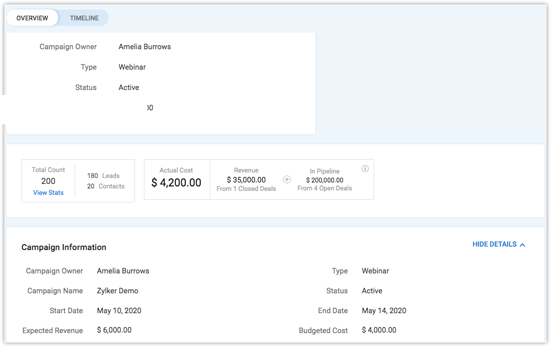 Sur la page Campagne, vous pourrez consulter le nombre total de leads et de contacts associés à cette campagne, suivre les détails relatifs aux coûts et aux revenus pour cette campagne et voir plus d'informations.