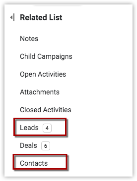 - Sur la page Détails de la campagne, les détails des leads ou contacts associés, le cas échéant, sont affichés dans les listes associées de leads/contacts.