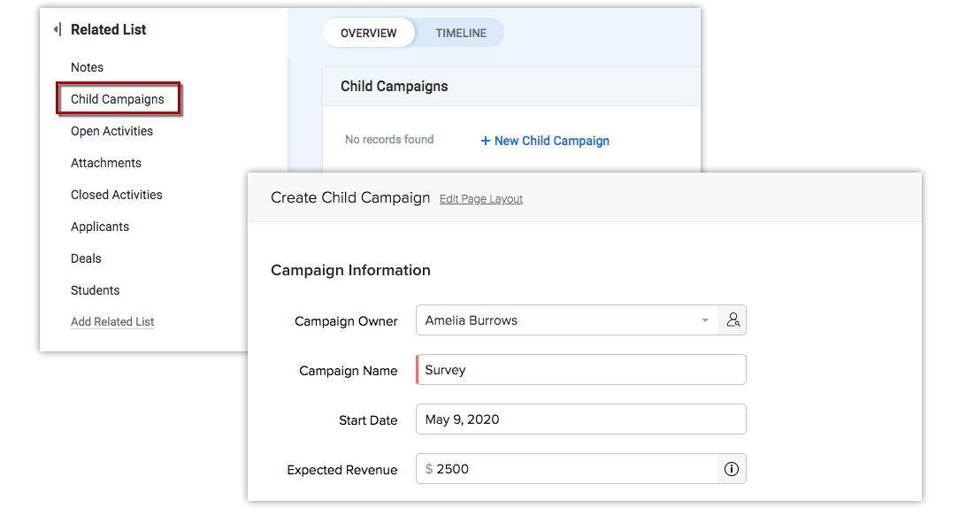 Dans Zoho CRM, vous pouvez ajouter jusqu'à 5 campagnes enfants à une seule campagne parent. De plus, chacune de ces campagnes enfants peut être associée à 2 campagnes enfant. Vous pouvez créer des campagnes enfants de deux façons :