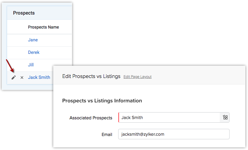 Afin de gérer cette diversité, Zoho CRM vous permet de créer un module nommé Module de liaison. Chaque association entre deux modules (créés par l'intermédiaire d'un champ de recherche à sélection multiple) est créée sous la forme d'un enregistrement dans le module de liaison. Ainsi, si trois offres sont associées à Jack, trois enregistrements distincts sont créés dans le module de liaison. Ceci vous permet de créer un loyer négocié séparé dans chaque enregistrement.