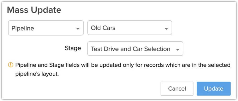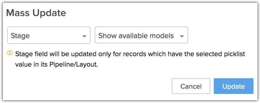 Lorsque vous mettez à jour des enregistrements en masse, gardez à l'esprit qu'un pipeline est spécifique à la disposition et que les étapes qu'il contient sont spécifiques à un pipeline particulier. Lors de la mise à jour en masse, les enregistrements sont toujours vérifiés pour une correspondance dans l'ordre suivant : disposition > pipeline > étape. (Vous pouvez mettre à jour en masse la disposition, le champ de pipeline et le champ d'étape sur les enregistrements).