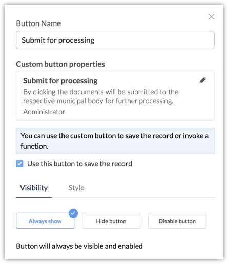 Visibilité - Vous pouvez définir la visibilité du bouton sur : toujours afficher, masquer ou désactiver. Vous pouvez également définir des conditions dans lesquelles le bouton doit être masqué ou désactivé. Par exemple, si les champs d'adresse de correspondance et d'adresse e-mail sont vides, le bouton Suivant doit être désactivé/masqué.