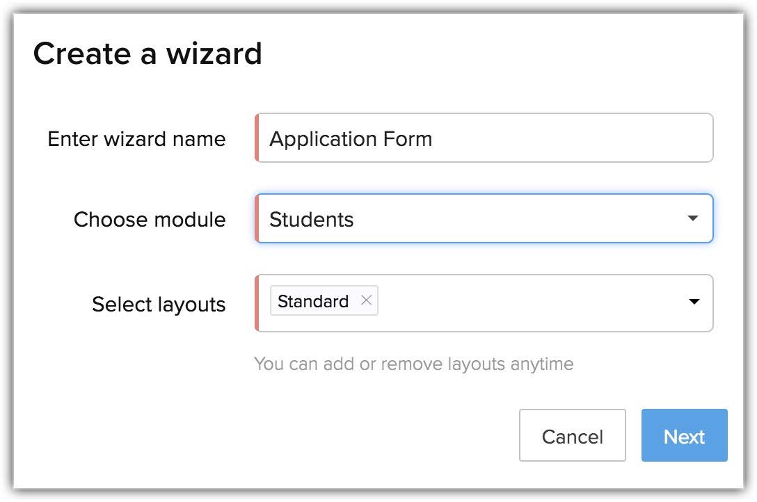 Dans Zoho CRM, vous pouvez personnaliser la page des détails de l'enregistrement à l'aide d'assistants pour segmenter un formulaire unique en plusieurs segments concis. Chaque section s'affiche sous forme d'écran et l'utilisateur peut naviguer entre les écrans à l'aide de boutons tels que suivant, enregistrer, plus, etc. Vous pouvez créer des assistants dans des modules standard et personnalisés et dans différentes dispositions (vous pouvez ajouter jusqu'à 4 dispositions).