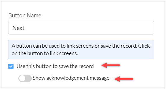 Boutons - Les boutons peuvent être utilisés pour sauvegarder un enregistrement ou pour lier différents écrans. Dans un seul écran, vous pouvez ajouter jusqu'à 10 boutons. Vous ne pouvez utiliser qu'un seul bouton pour lier un écran. En fonction de l'action que vous souhaitez que ces boutons exécutent, vous pouvez les nommer : Enregistrer, Suivant, Modifier, Nom du produit, etc. Vous pouvez spécifier si un bouton doit être utilisé pour sauvegarder un enregistrement en cochant l'option Utiliser ce bouton pour sauvegarder l'enregistrement. Par exemple, vous pouvez cocher cette option pour vous assurer que l'enregistrement est sauvegardé lorsque le bouton Terminé, Soumettre ou Enregistrer est utilisé par l'utilisateur.