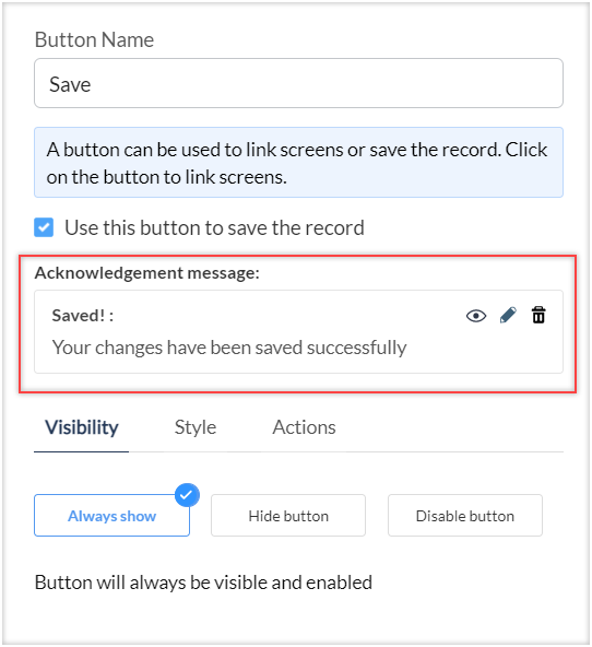 Vous pouvez également activer/désactiver le bouton Afficher le message de confirmation pour afficher un message lorsque l'utilisateur clique sur le bouton Enregistrer. Pour chaque bouton, vous pouvez définir la visibilité, le style et les actions.