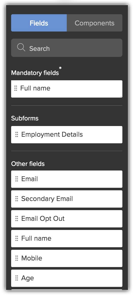 - Champs - Tous les champs, sections et sous-formulaires que vous avez ajoutés à la disposition s'affichent sous l'onglet Champs, à l'exception des champs de recherche à sélection multiple et des champs utilisateur. Vous pouvez faire glisser et déposer les champs souhaités dans chaque segment.