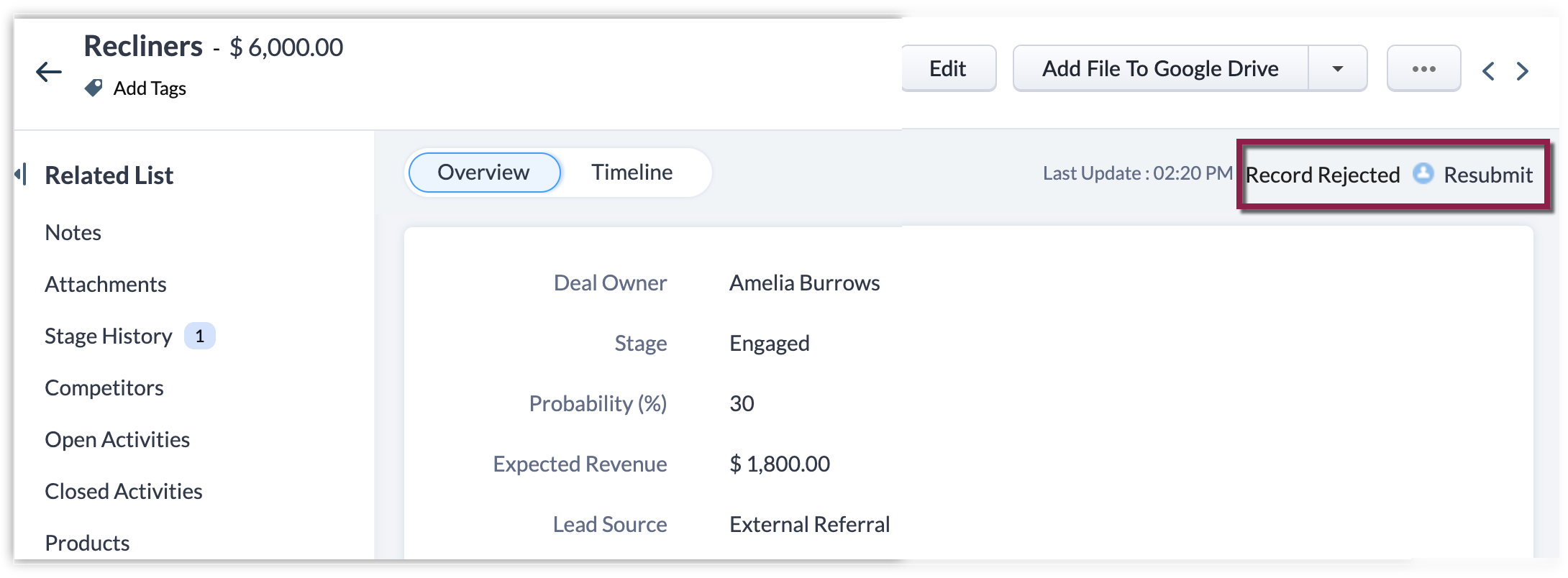 - Les enregistrements qui sont rejetés peuvent être soumis à nouveau à approbation à partir de la page de Détails de l'enregistrement.