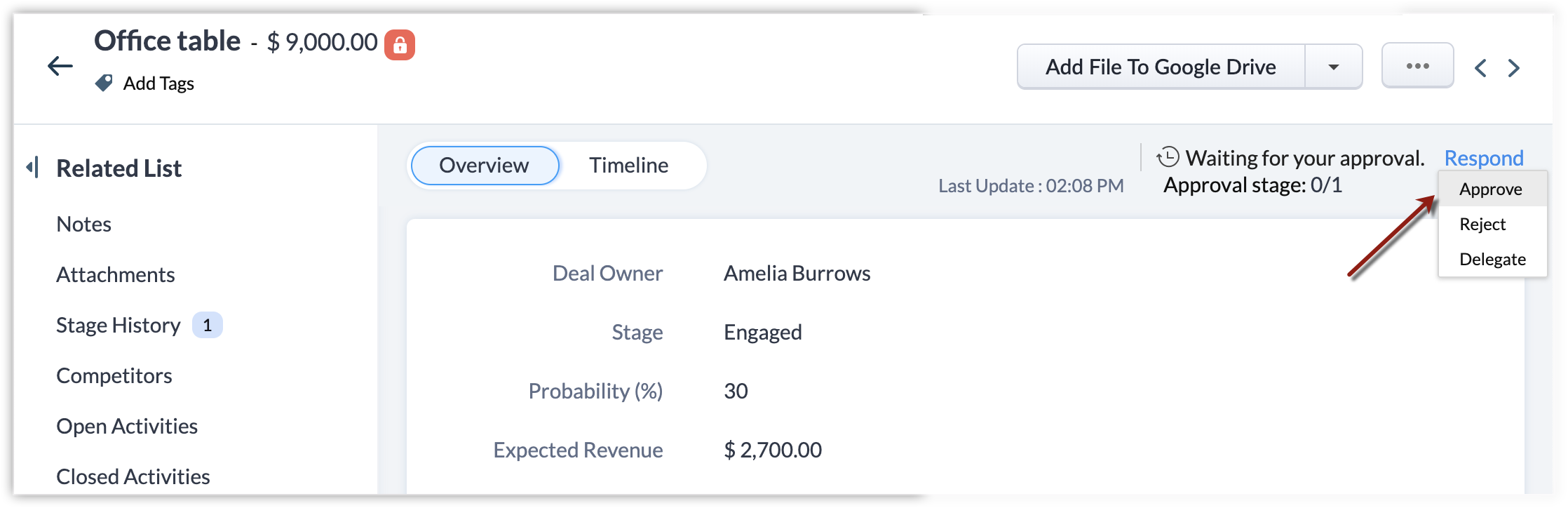 - Lorsqu'un enregistrement est en attente d'approbation, les options Convert (Convertir), Delete (Supprimer) et Edit (Modifier) sont désactivées. L'enregistrement sera marqué comme Waiting for approval (En attente d'approbation) et une option permettant de Répondre (Approuver, Déléguer ou Rejeter) sera disponible dans la page de détails de l'enregistrement.
