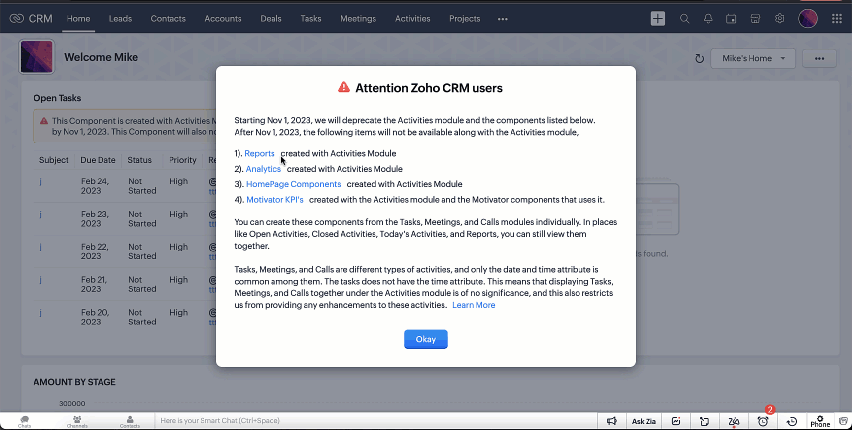 La suppression de l'onglet Activities aura lieu d'ici le 1er décembre 2023, après quoi vous ne le verrez plus apparaître dans Zoho CRM.