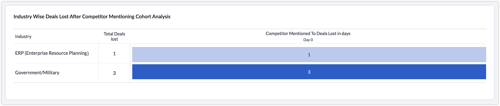 Comme vous le savez peut-être, chaque tableau de bord VoC de Zoho CRM est conçu pour vous offrir un aperçu spécifique. Par exemple, étudions le graphique de cohorte suivant, configuré pour le module Contacts. Ce graphique donne un aperçu des marchés que vous avez perdus peu de temps après que vos clients ont mentionné certains de vos concurrents. Ces informations sont représentées par secteur d'activité et sur une période donnée. Par exemple, selon le tableau ci-dessous, vous avez perdu 3 contrats avec des clients appartenant au secteur gouvernemental/militaire au cours de la première journée où ils ont mentionné un concurrent.