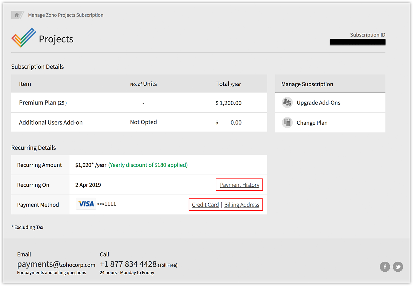 Vous pouvez modifier vos données de carte de crédit à tout moment. Cliquez sur votre image de profil dans le coin supérieur droit de la bande de navigation supérieure de Zoho Projects. Sélectionnez Détails de l'abonnement pour afficher les ...