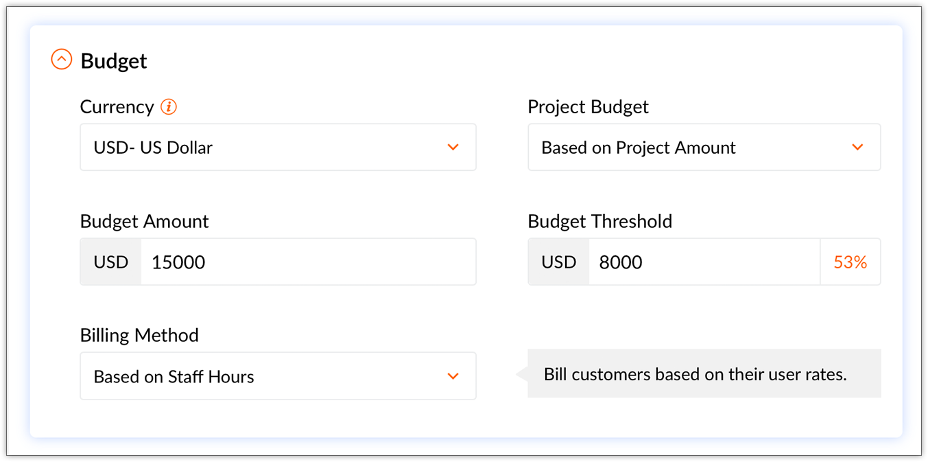 - Sélectionnez En fonction du montant ou En fonction des heures dans le champ Budget du projet pour configurer/créer un budget pour votre projet. Vous pouvez également définir un budget en fonction des jalons ou des tâches. Si vous ne souhaitez pas configurer de budget pour le moment, sélectionnez Aucun.