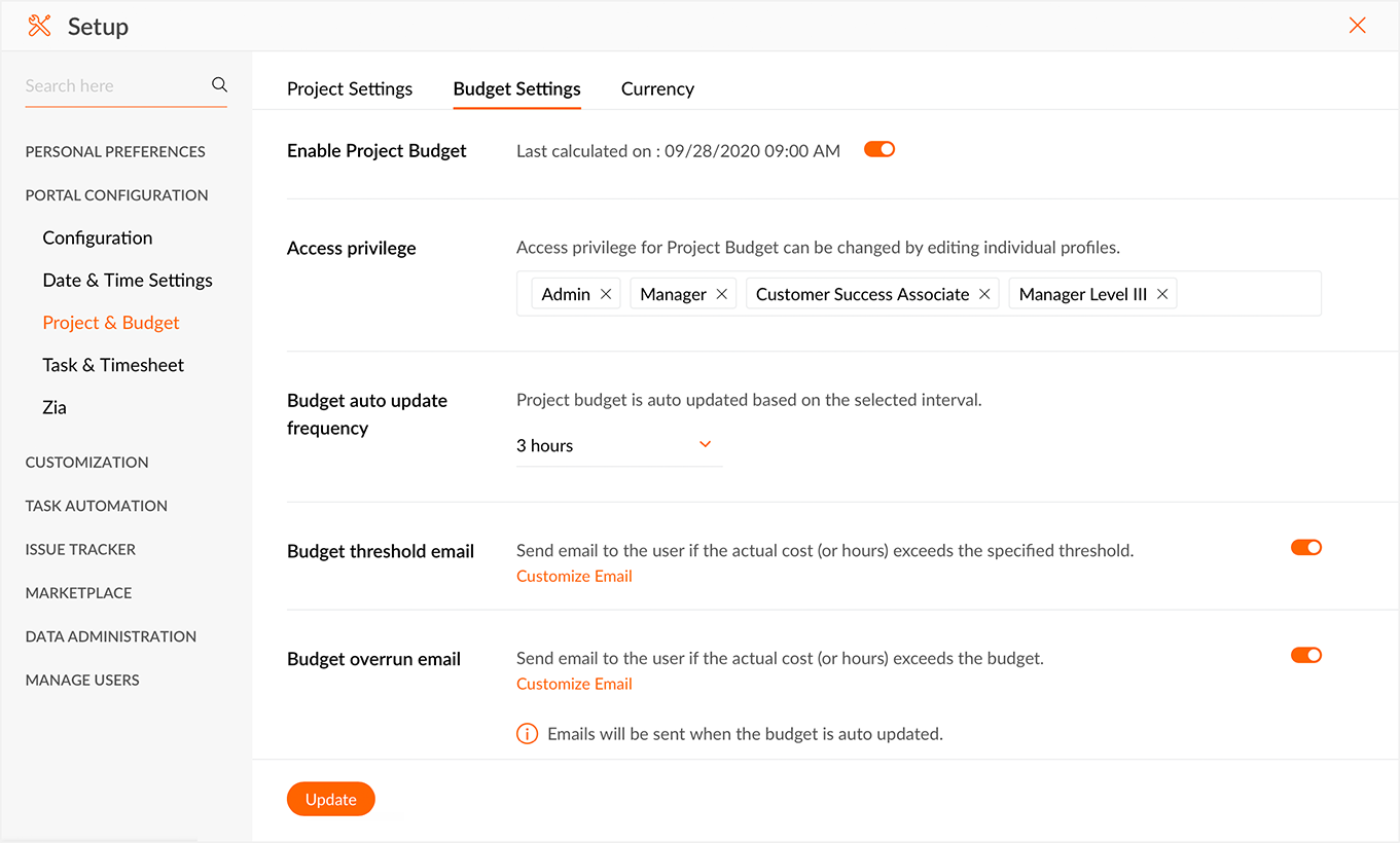 - Le Budget du projet est activé par défaut pour les profils d'administrateur.