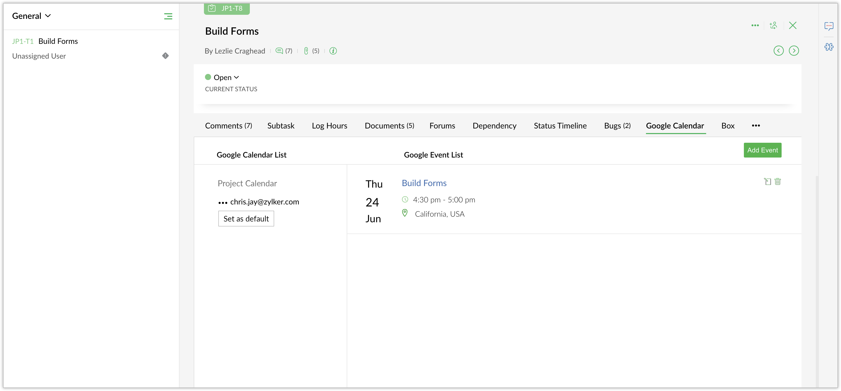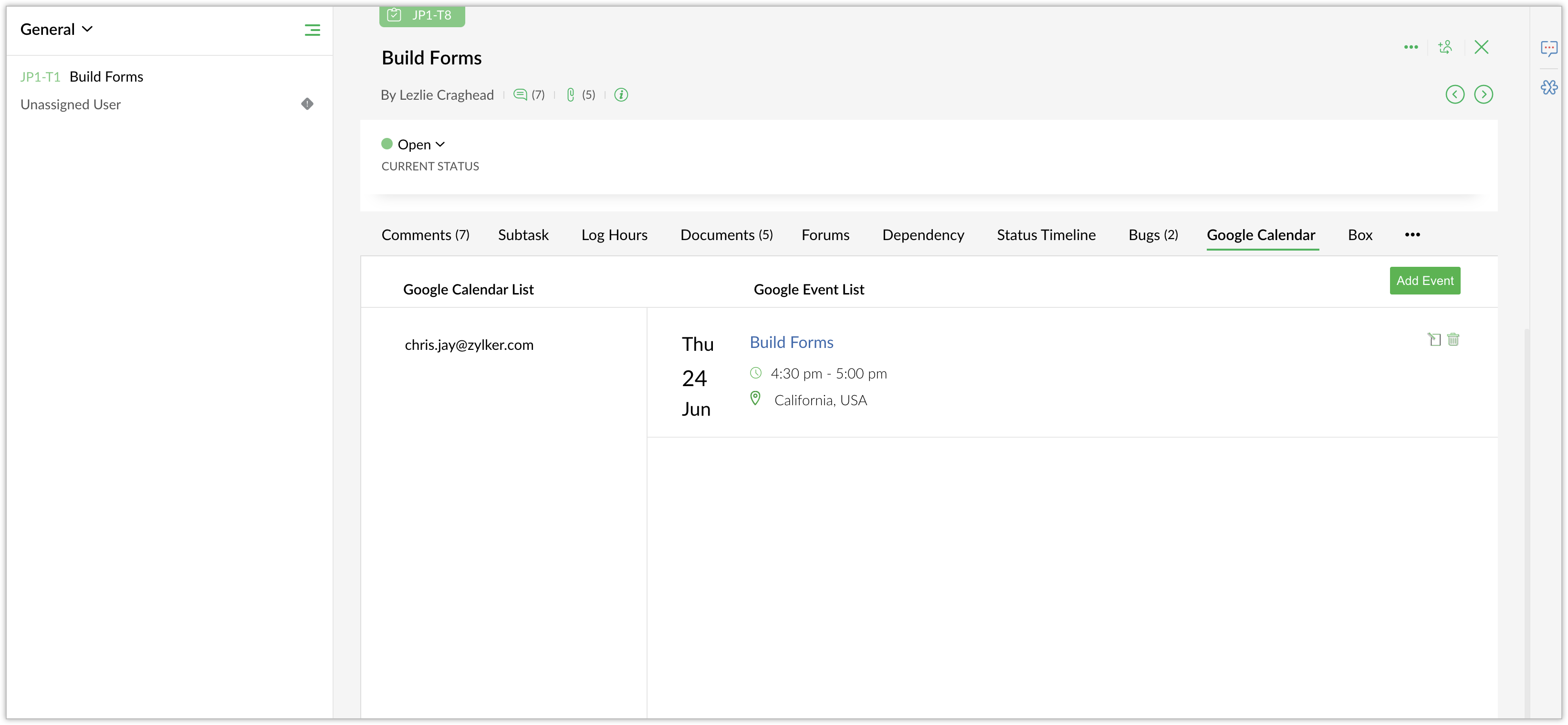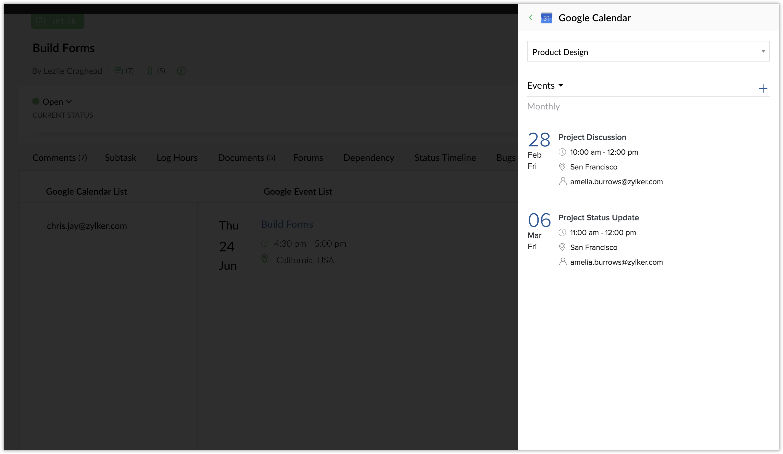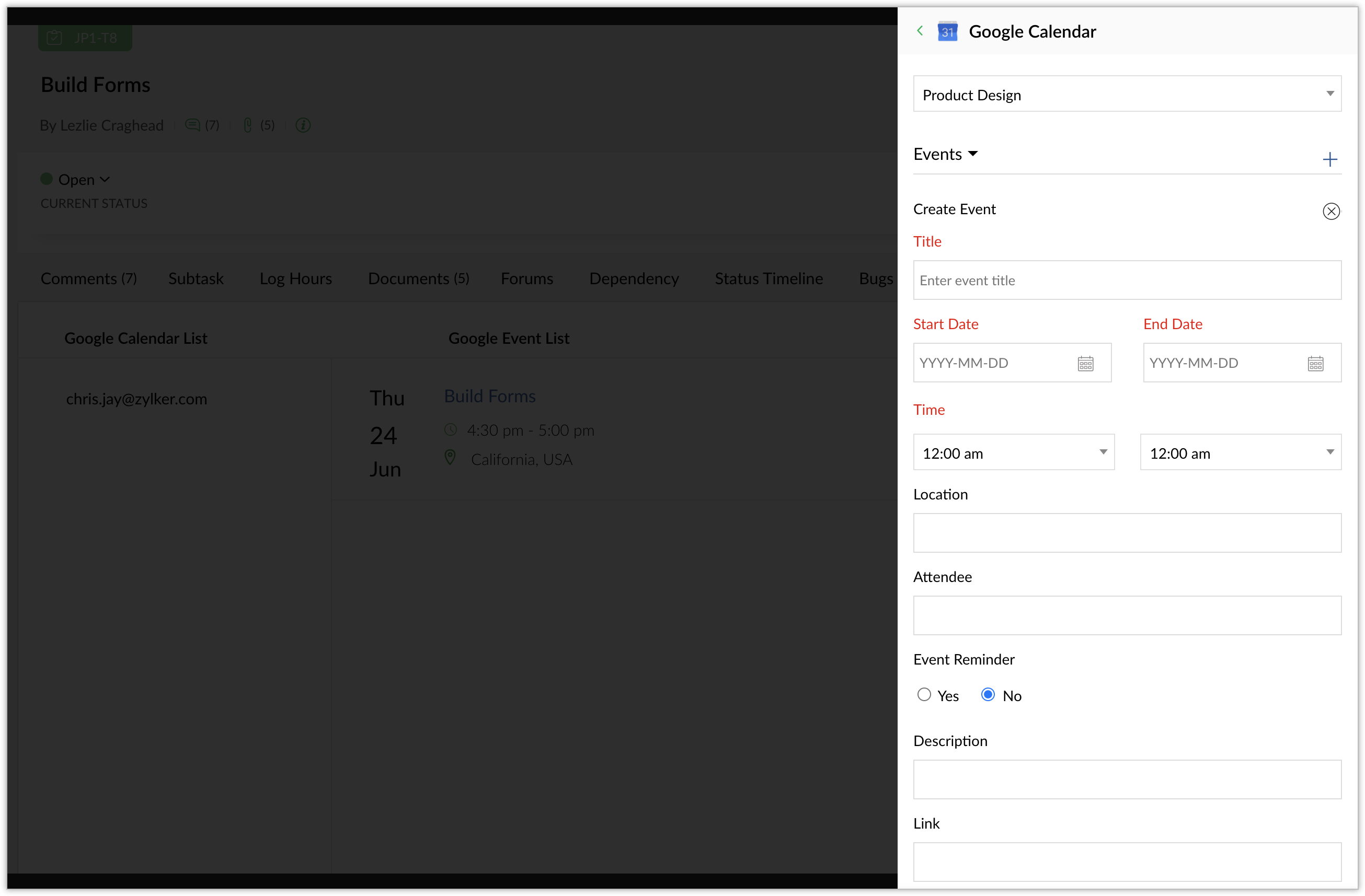 L'extension Google Calendar pour Zoho Projects vous permet de créer des événements dans Zoho Projects et de les synchroniser avec votre Google Calendar. Vous pouvez désormais planifier, modifier ou supprimer des événements dans Google Calendar depuis Zoho Projects. Cette extension vous permet également de définir des rappels pour informer les propriétaires des événements à venir.